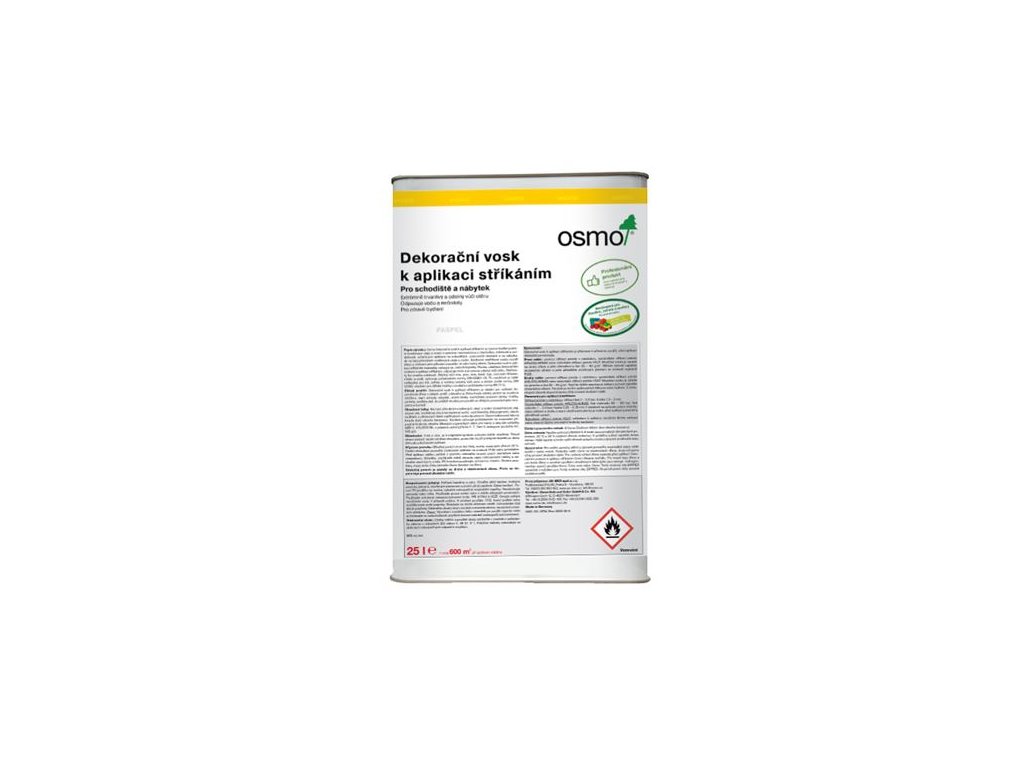 Vysoce účinná mikroporézní kombinace olejů a vosků s vysokou chemickou a mechanickou odolností, určená pro schody, pracovní desky a nábytek. Osmo Dekorační vosk k aplikaci nástřikem na bázi přírodních olejů a vosků je odolný vůči nečistotám, vodě a oděru a vytváří hladký povrch. Vhodné pro dřevo – mikroporézní povrch, který nepraská, neloupe se, netvoří šupinky. Odolný vůči vínu, pivu, kole, kávě, čaji, ovocným šťávám, mléku a vodě, vyhovuje požadavkům normy DIN 68861-1A, zamezuje vzniku stop po vodě. Po zaschnutí je nátěr neškodný pro lidi, zvířata a rostliny. Je vhodný i pro dětské hračky v souladu s požadavky EN 71.3 a odolný vůči potu a slinám podle normy DIN 53160. Osmo Dekorační vosk k aplikaci nástřikem s protiskluzovým efektem je ideální pro nátěry dřevěných ploch v interiéru všude tam, kde je požadována trvanlivost, nízké nároky na údržbu , odolnost vůči vysokému zatížení a zejména pak protiskluzový efekt. K použití např. pro schody, parkety, podlahy apod. Doba životnosti je 5 let a více, je-li výrobek uchováván v těsně uzavřené nádobě na suchém místě. Pokud výrobek vlivem nízkých teplot zhoustne, je třeba ho pro znovunabytí původní konzistence ponechat při pokojové teplotě po dobu 24 – 36 hodin před vlastní aplikací.Doplňkové parametry