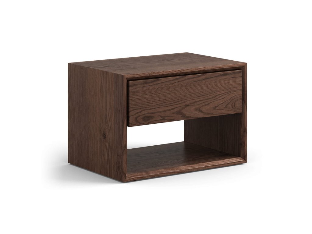 Na první pohled se noční stolek Adria zdá být nenápadný – ale stačí chvilka, abyste si všimli jeho jedinečného kouzla. Teplý odstín tabáku, připomínající tmavé dřevo staré knihovny, je plný šarmu a vyvolává příjemné asociace. Olejovaný povrch jemně leskne ve světle a zdůrazňuje kresbu letokruhů, které doslova vyprávějí svůj přirozený příběh. Je to nábytek vytvořený pro ty, kteří milují harmonii a klid – v ložnici, kde má každý detail svůj význam. Jeho geometrická forma se perfektně hodí do minimalistických, loftových, ale i klasických interiérů. Stojí stranou, nedominuje, ale svou přítomností vnáší do každého interiéru útulnost.