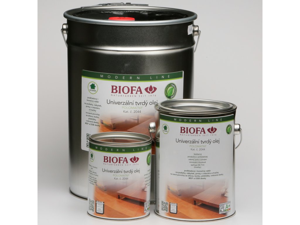 Biofa Univerzální tvrdý olej je vysoce kvalitní směs přírodních pryskyřic a rostlinných olejů určená pro profesionální i domácí použití. Díky svému složení vytváří tenký ochranný film, který dřevu poskytuje pevnost, odolnost a polomatný vzhled s minimální tendencí ke žloutnutí. Olej je vhodný k ošetření savých dřevěných, korkových a OSB povrchů, stejně jako nábytku či interiérových obkladů.
