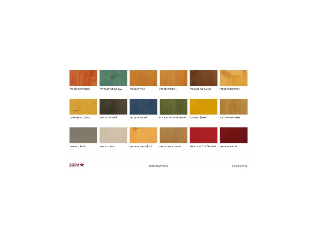 Karnaubský vosk dodává povrchu tvrdost a odolnost, zatímco přidané přírodní pigmenty umožňují jemné tónování do široké palety odstínů. Transparentní varianta zvýrazňuje přirozenou kresbu dřeva, bílý odstín dodává svěžest a moderní vzhled. Na objednání je možné vybírat z 18 základních barevných odstínů podle vzorníku.