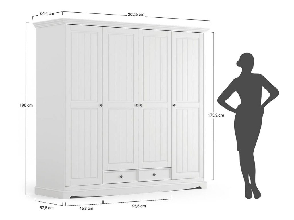 Bílá skříň dostupná v našem obchodě je vyrobena z masivního dřeva. Byla pokryta bílou barvou na vodní bázi - včetně vnitřku (s výjimkou bočnic zásuvek). Použitá univerzální bílá (RAL 9010) se hodí jak do ložnice, tak do haly - výrazně zesvětlí interiér. Pokud hledáte menší kus nábytku tohoto typu, nezapomeňte se podívat na naše dvoudveřové skříně a 3dveřové skříně v různých barvách. Rovněž vám doporučujeme seznámit se s kolekcí Belluno Elegante. Skládá se z velkého počtu produktů nejvyšší kvality. Provensálský nábytek z této kolekce se skvěle hodí do ložnice, haly, jídelny, obývacího pokoje a pracovní místnosti.