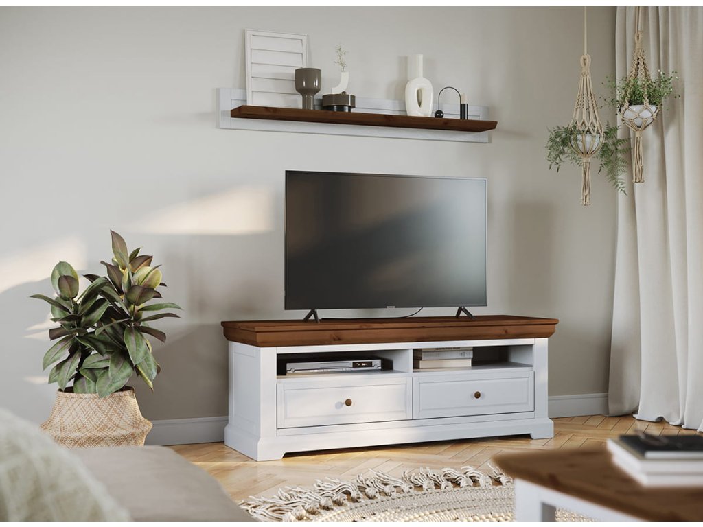 Dřevěná skříň RTV Marone Elite v barvě bílé/tabaková se vyznačuje funkčností a nadčasovým designem, díky čemuž je nepostradatelným kusem nábytku prakticky do každého domu a bytu. Za její praktičnost jsou mimo jiné zodpovědné dvě zásuvky ve spodní části, které poskytují diskrétní úložný prostor, zatímco otevřené police nad nimi jsou ideální pro elektronické vybavení. A co víc - harmonická kombinace bílé a tmavé horní části dělá z této skříňky ideální doplněk do obývacích pokojů, kde převládá venkovský nebo skandinávský styl, zvláště když přirozené světlo bude moci denně zvýrazňovat její nepopiratelný půvab.