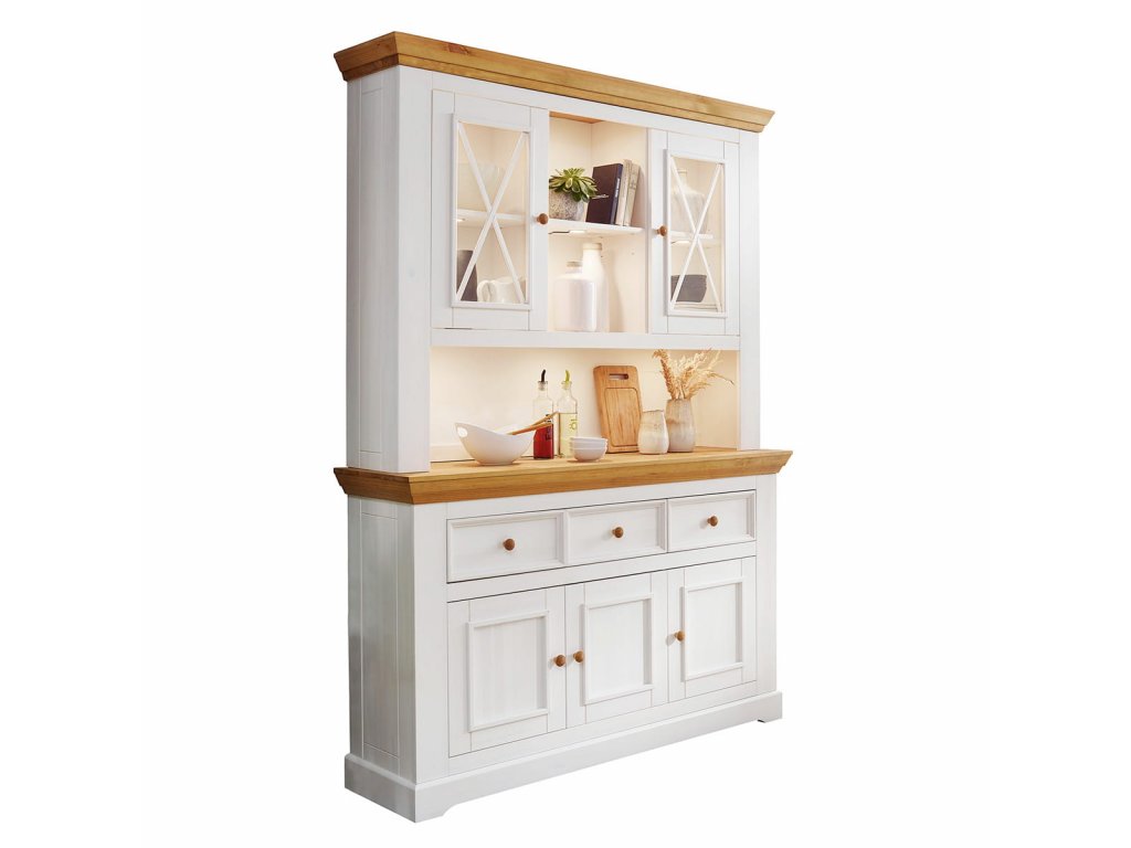 Bílý nástavec i komoda jsou vyrobeny z kvalitního masivního borovicového dřeva. Jejich povrch je opatřen voskem, který vyhlazuje póry dřeva a chrání je před negativními vlivy vlhkosti. Vosk má neúplnou krycí schopnost, takže povrch nábytku zachovává charakteristickou strukturu dřeva, což dodává nábytku ušlechtilý a rustikální vzhled. Bílý prosklený jídelní příborník je inspirován venkovským stylem staré Provence, kde se spojuje elegance s romantikou. Dřevěný nábytek působí elegantním a moderním dojmem, zatímco provensálské prvky mu dodávají útulný a přívětivý nádech.