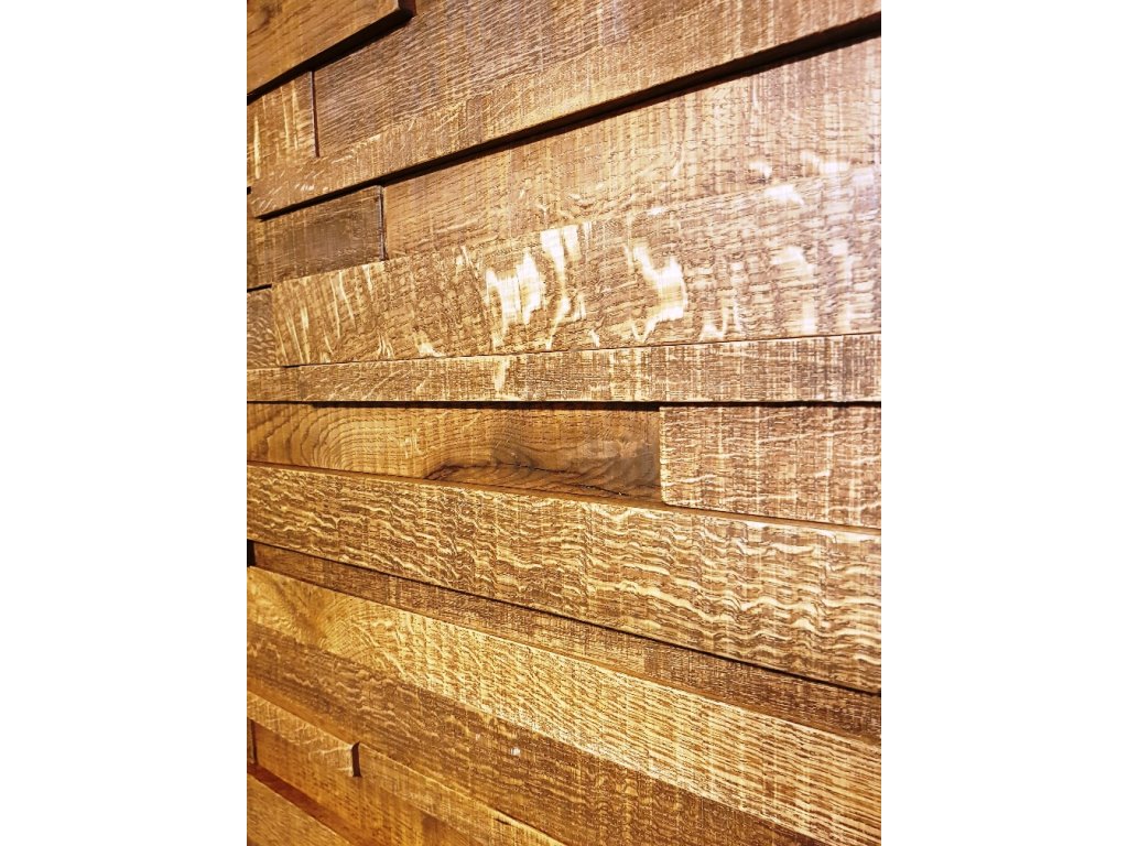 Dubové dřevo je v nábytkářství velmi populární a krásné jsou z této odolné a pevné dřeviny také vnitřní obklady na stěnu. Navíc poslouží k zakrytí nerovných zdí a tepelně a zvukově izolují. Dubový obklad je poskládán z různě dlouhých, širokých a tlustých hranolků, jejichž povrch je katrovaný. Povrch tak není zcela hladký jako u hoblování, ale má malé vlnky, dřevo tak vypadá jako by bylo nařezáno na dřívějších katrových pilách. Dubový katrovaný obklad je na fotce naolejován barevným odstínem 3166 ořech, ale nejkrásnější je olejovaný v přírodní barvě dřeva. Cena je za 1 m².