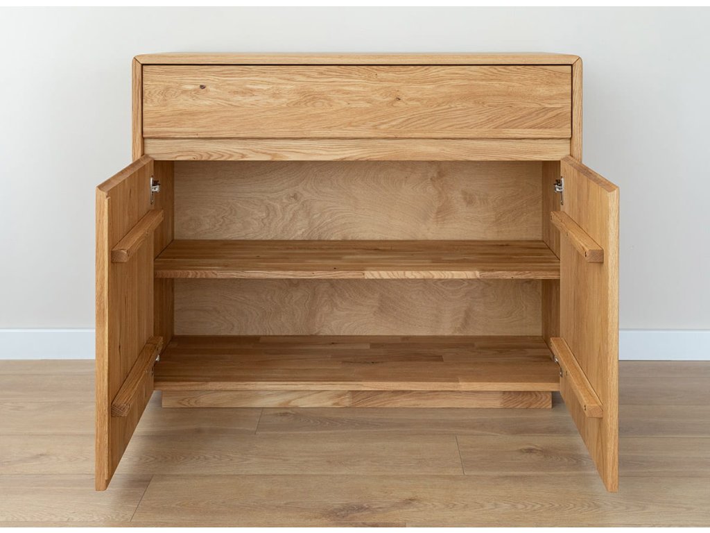 Komoda Tossa 1.2 je vyrobena výhradně z masivu dubu. Je to masivní, ale krásně vyvážený kus nábytku. Dřevo bylo ošetřeno přírodním olejem Hesse, což zajišťuje, že si zachovává svůj charakter a časem vypadá ještě lépe. Při dotyku na horní část cítíte mírný odpor konstrukce – dřevo nebylo vyleštěno do hladka, ale ponecháno s jeho přirozenou texturou. Pyšní se také pevnou konstrukcí a precizním zpracováním: dokonale zarovnané hrany, hladký chod zásuvek a snadné zavírání dvířek. Jednoduché, ale elegantní. Tento kus nábytku vám zůstane po mnoho let a stane se dokonce rodinným dědictvím, které se bude dědit z generace na generaci.