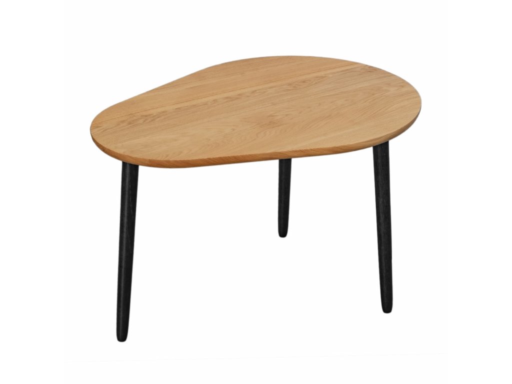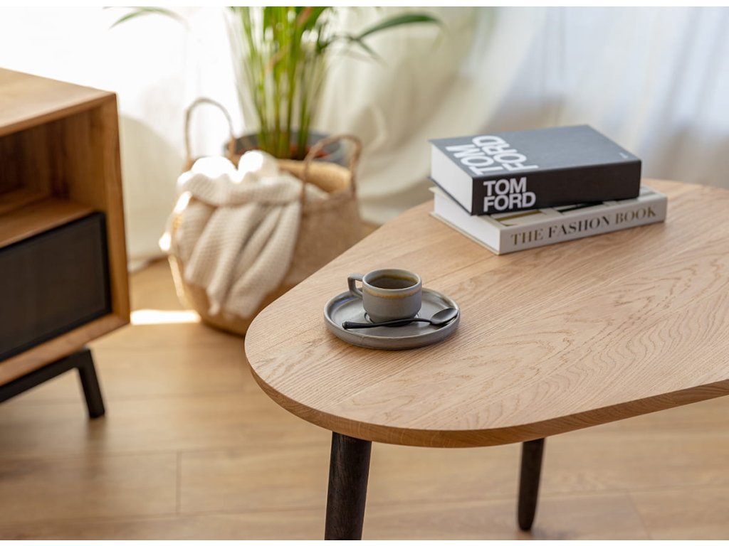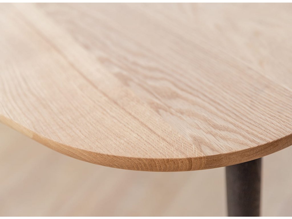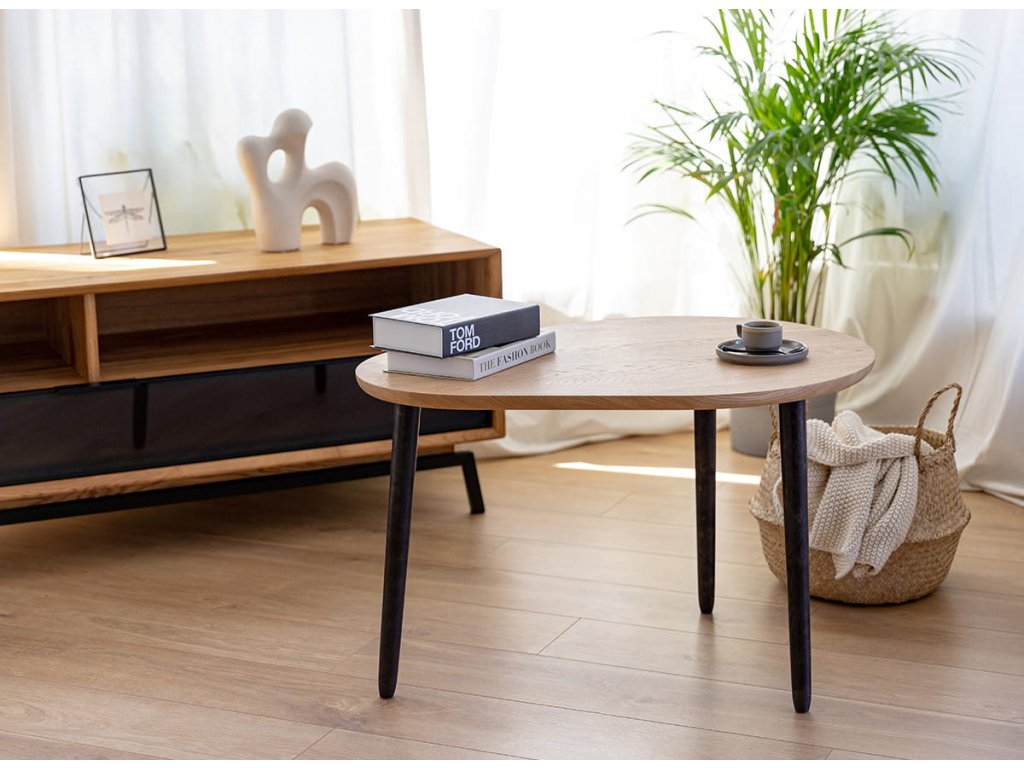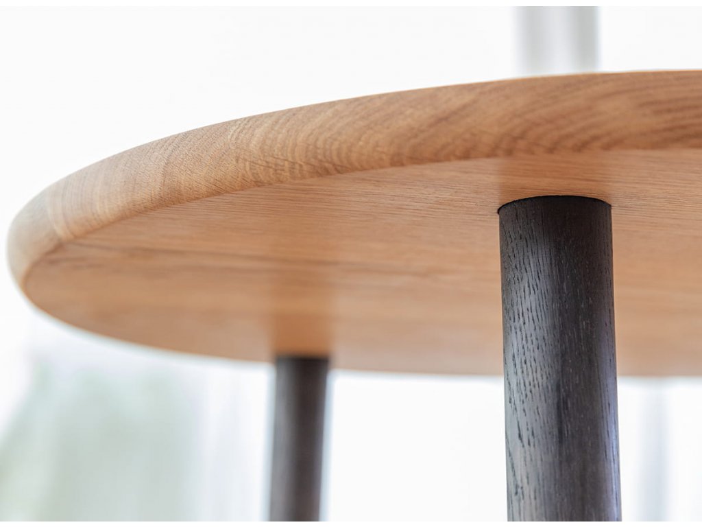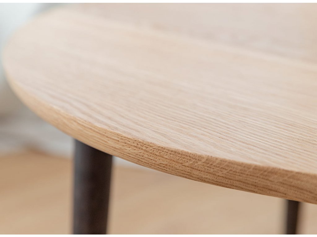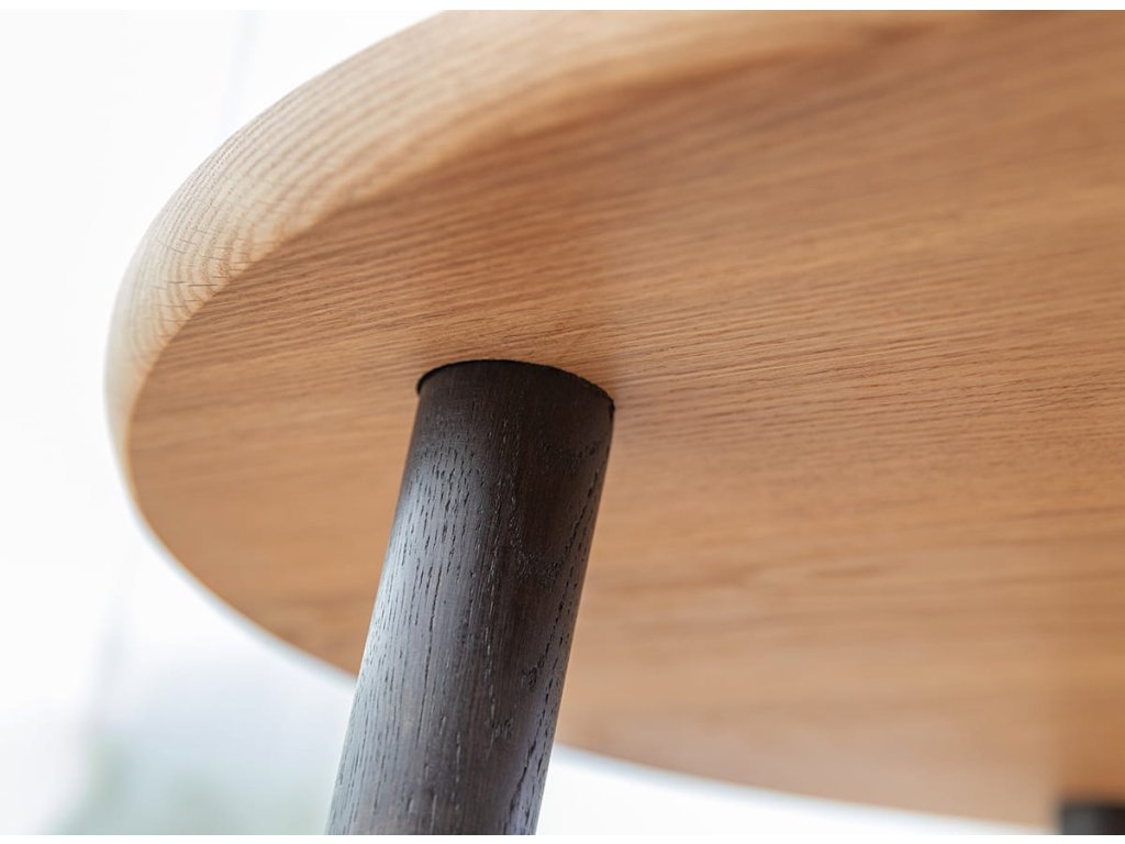 Konferenční stolek je podepřen třemi dubovými nohami v černé barvě s viditelnou strukturou dřeva, které se vyznačují štíhlým tvarem. Tato kombinace vytváří vizuálně lehké tělo, které krásně vynikne v každém obývacím pokoji.