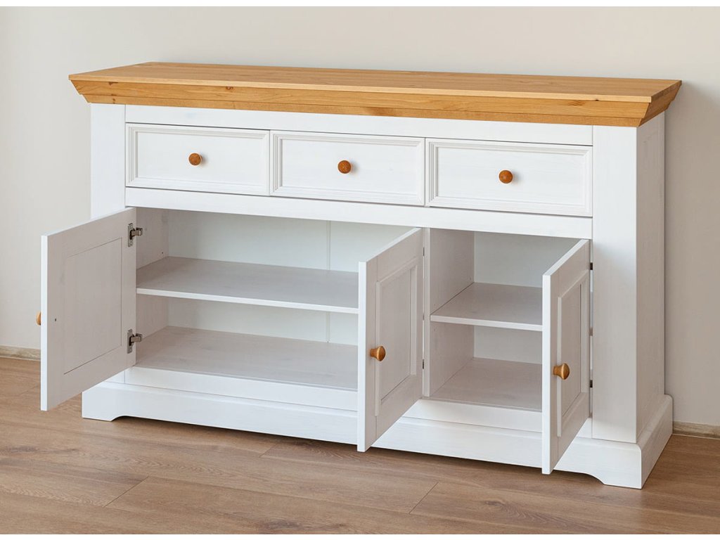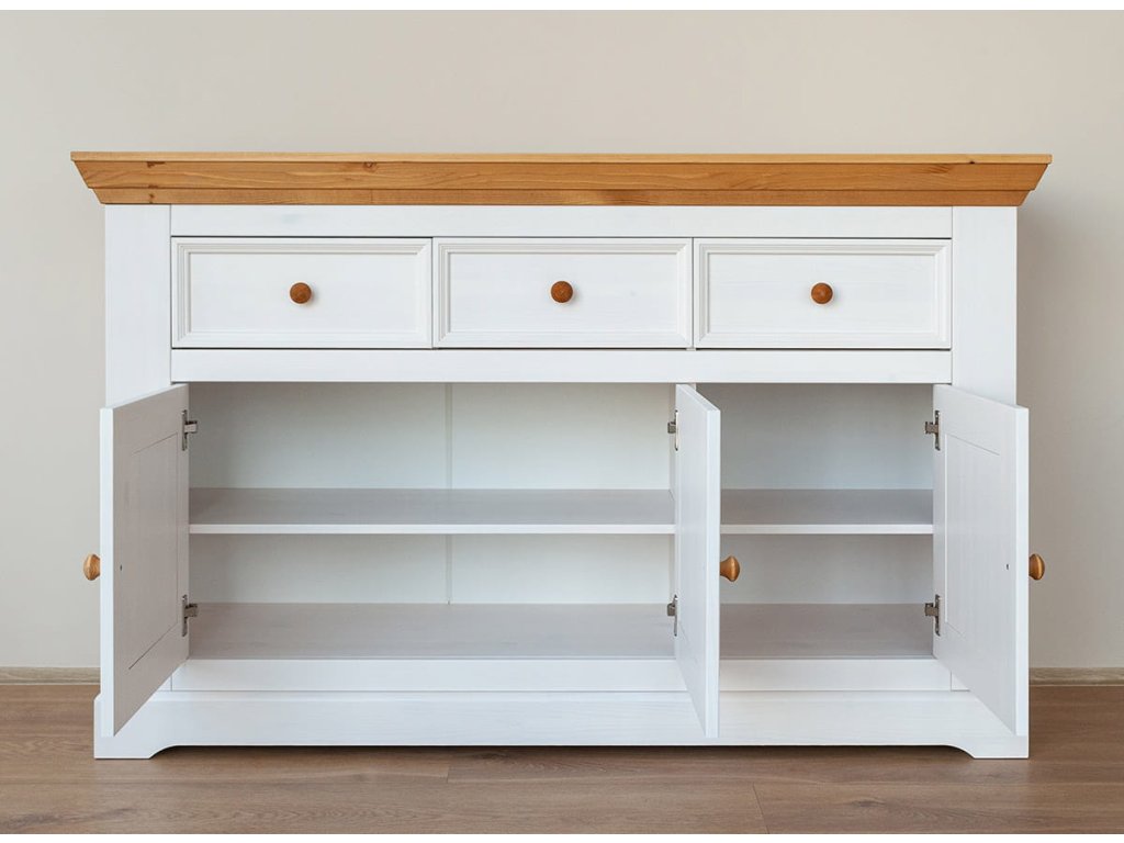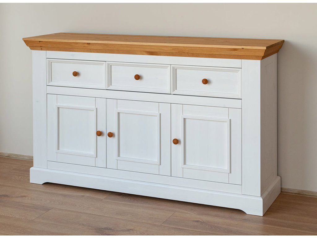 Dřevěný nábytek má tu výhodu, že dokáže pohlcovat vlhkost ze vzduchu, což přispívá ke vzniku zdravého a přívětivého mikroklima ve Vašem domě. Komoda má jedny dvojité dveře na levé straně a jedny jednoduché dveře na pravé straně. Rozdělena je na 2 police a nad skříňkami jsou umístěny 3 zásuvky, což poskytuje dostatek úložného prostoru pro Vaše věci.