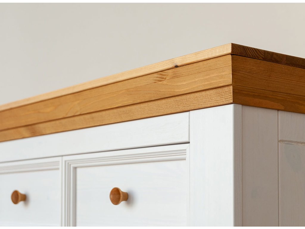 Dřevo je natřeno bílým voskem, který chrání komodu před vlhkostí a opotřebením. Mořidlo na úchyty a horní část komody ji chrání před odřením a mechanickým poškozením. Použité impregnační prostředky zaručují, že si bílá komoda zachová svůj krásný vzhled po dlouhou dobu. Vyfrézované horní a spodní ráfky opticky lehčí celkový vzhled komody.