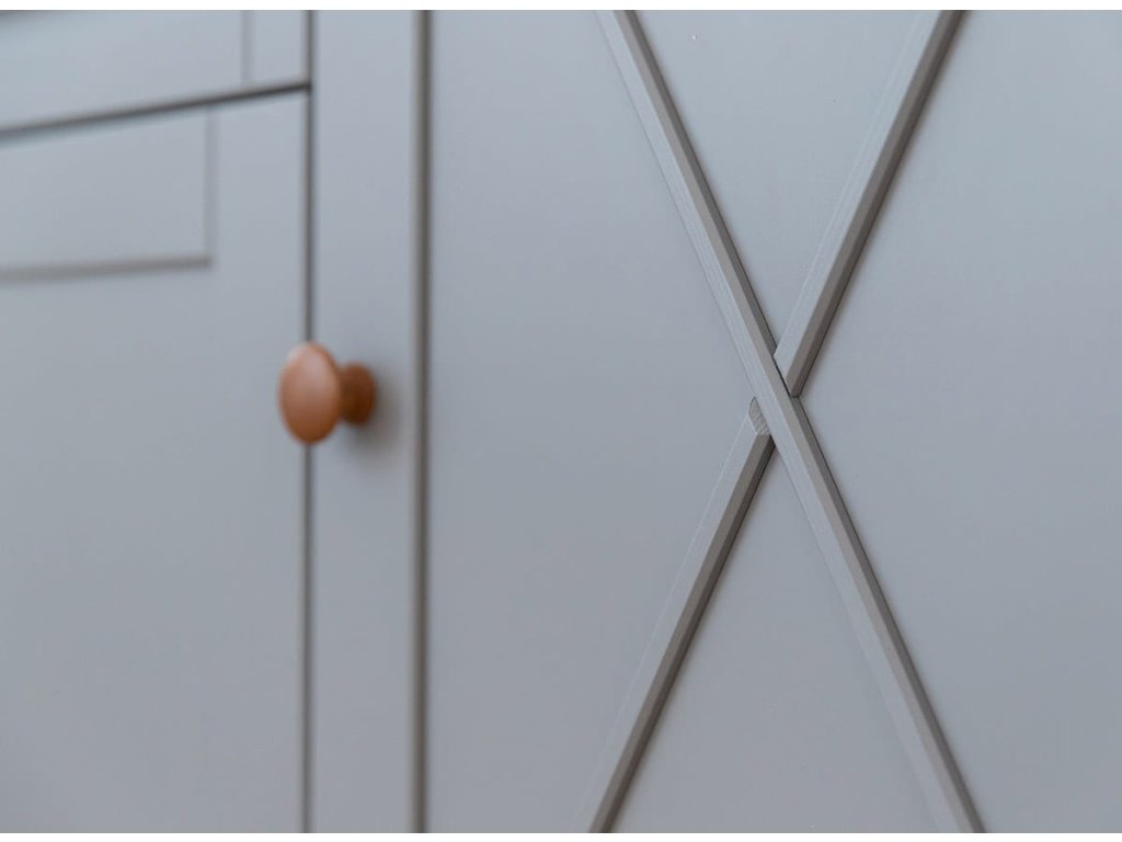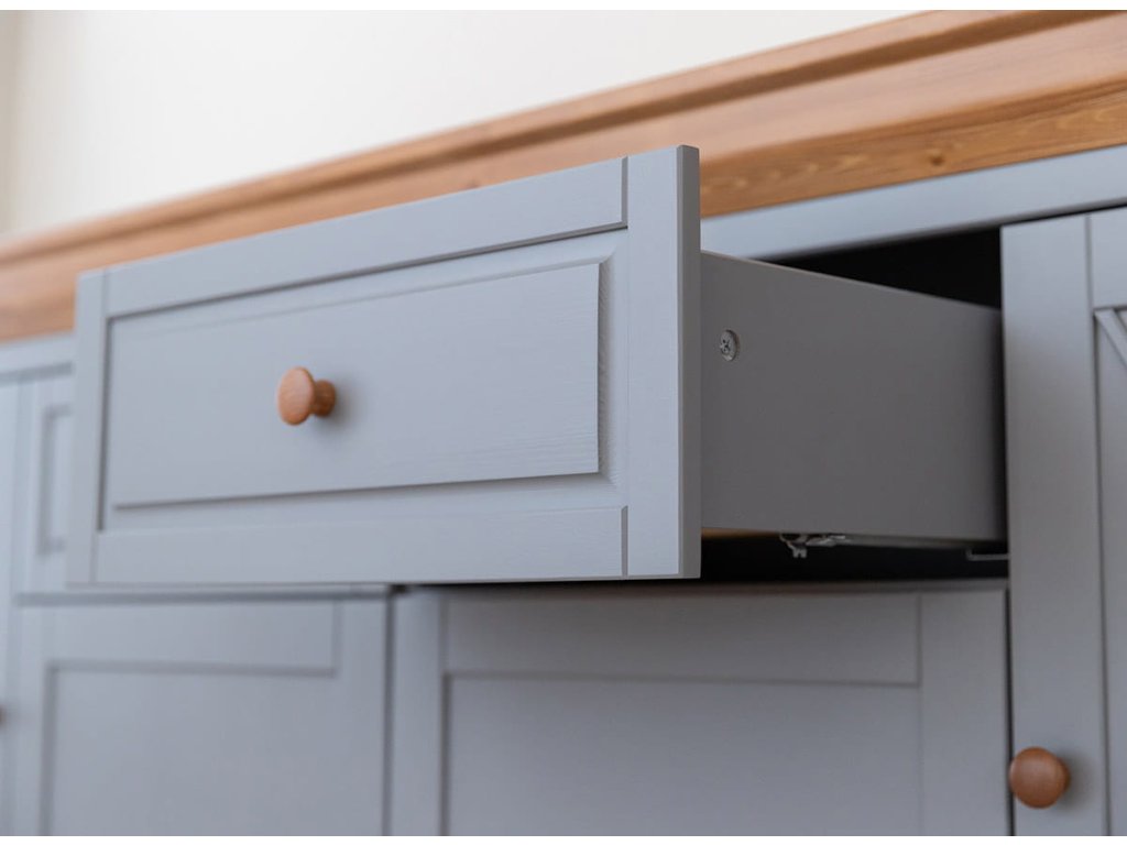 Komoda Marone Elite 2.4 je vyrobena z kvalitní finské borovice, která je vynikající díky své pevnosti a odolnosti vůči extrémním podmínkám, jako jsou silné mrazy nebo vysoké teploty. Navzdory nedostatku živin roste tato odrůda borovice zdravě a silně. Díky tomu se dřevo snadno zpracovává, což nám umožnilo vyrábět frézy na podstavci a šikmé lamely na čelech skříněk.