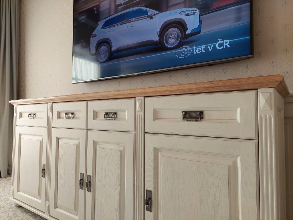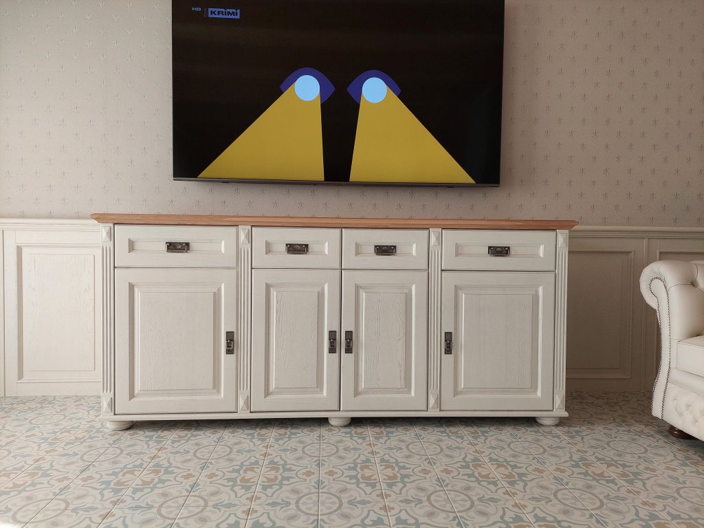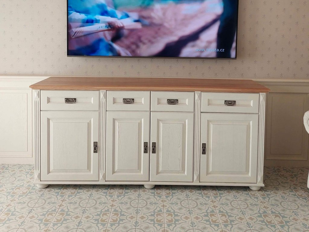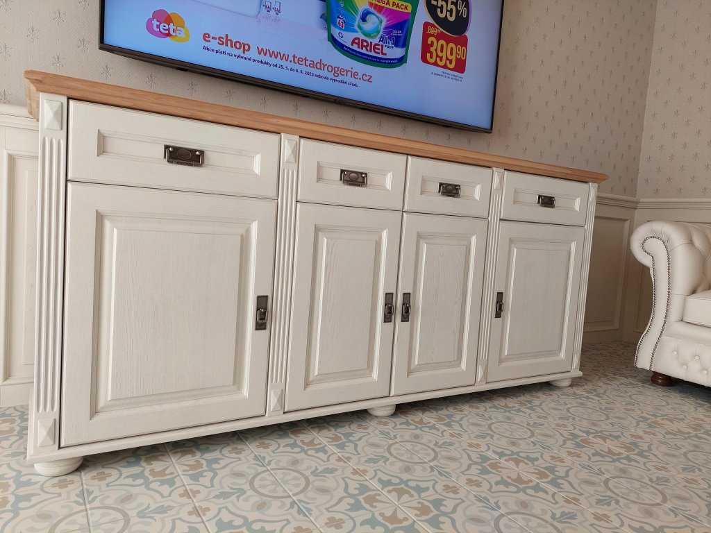 Komoda je doplněna o elegantní starostříbrné úchytky a v teplé bílé barvě, což ji ladí do provensálského stylu. Boční části zásuvek zůstávají v přírodním dubovém odstínu, což dodává komodě zajímavý kontrast. Komoda vynikne zejména u stěn, které nejsou bílé. Hodí se například ke kamenným či dřevěným obkladům v interiéru. Kromě tohoto provedení nabízíme komodu také s ořechovou nebo dubovou horní deskou a v dalších povrchových úpravách.