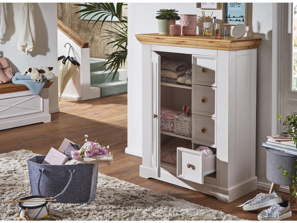Bílá komoda z finského borového dřeva vám pomůže vytvořit útulnou atmosféru ve vašem obývacím pokoji nebo jídelně. Tělo nábytku bylo pokryto voskem v odstínu bílé. Pevná, frézovaná horní část je v barvě medové borovice. Kulaté dřevěné rukojeti se vyznačují podobným odstínem . Ekologický vosk, který zakrývá komodu, má krytí 75%. To znamená, že pod jeho povrchem je viditelná kresba letokruhů a uzlů. Ty zase dávají každé kopii jedinečný znak.