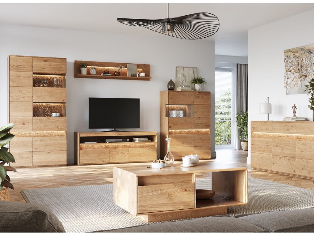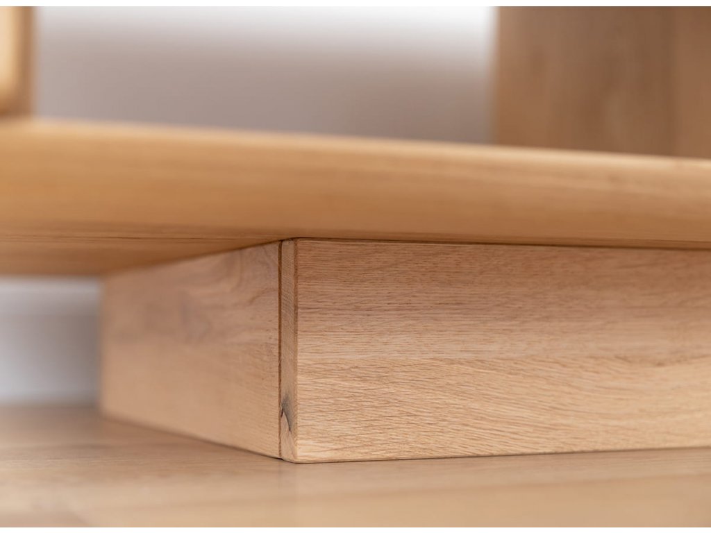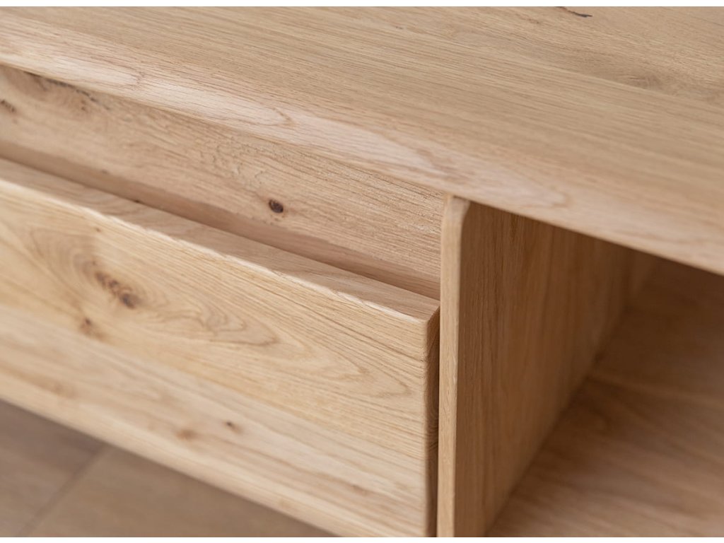 Pro váš domov nabízíme luxusní dubový nábytek do obývacího pokoje. Kromě kvalitních materiálů je pro nás důležitý i estetický vzhled. Olejovaný dubový stůl s viditelnými kruhy a suky v zlatisté barvě je krásným kouskem, který zkrášlí váš interiér. Kartáčovaný pás nad zásuvkou přidává nábytku dekorativní prvek.