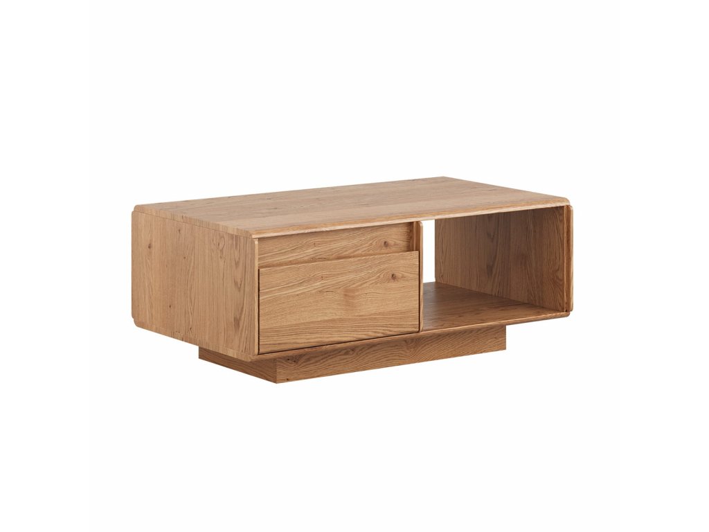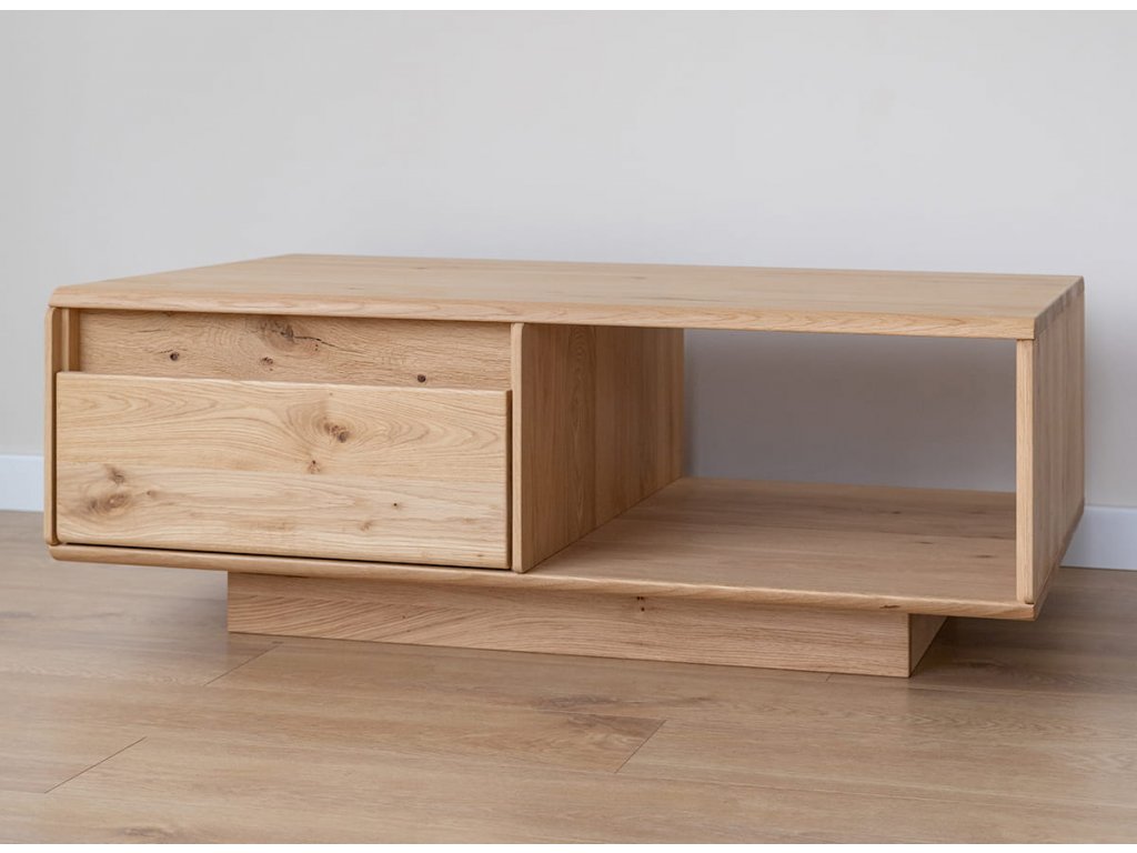 Funkční dubový konferenční stolek Divisione je ideální pro vaše zábavy i odpočinek v obývacím pokoji. Je vyroben z přírodního dubu, který je trvanlivý, pevný a přitom krásný. Stůl má jednoduchý a nadčasový design s viditelnými uzly a kroužky. Na prostorné desce můžete umístit kávu, občerstvení, vázu s květinami nebo svíčky. Pod ní se nachází praktický prostor na nádobu s kapesníky nebo dekorativní vázu. V zásuvce můžete uložit kabely, nabíječky, notebook nebo dálkové ovládání. Stůl je vhodný do menších i větších obývacích pokojů.