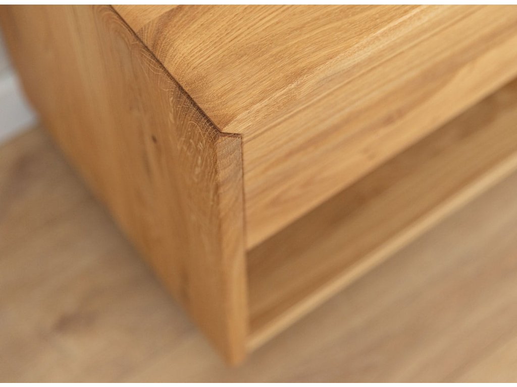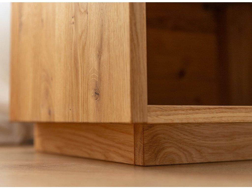 Celá konstrukce je vyrobena z masivu dubu – odolného a nadčasového materiálu. Povrch, ošetřený olejem Hesse, zdůrazňuje přírodní texturu dřeva a poskytuje matný, sametový vzhled. Zásuvka se otevírá hladce a pohodlně. Celý kus spočívá na pevném podkladu – nic se neviklá ani nevrzá, což svědčí o nejvyšší kvalitě. Zblízka můžete vidět propracovanost tohoto kusu – přesné spoje, perfektně sladěné čela a měkké hrany. Nejedná se o dočasný kus – je to něco, co ve vašem domě zůstane po dlouhou dobu.