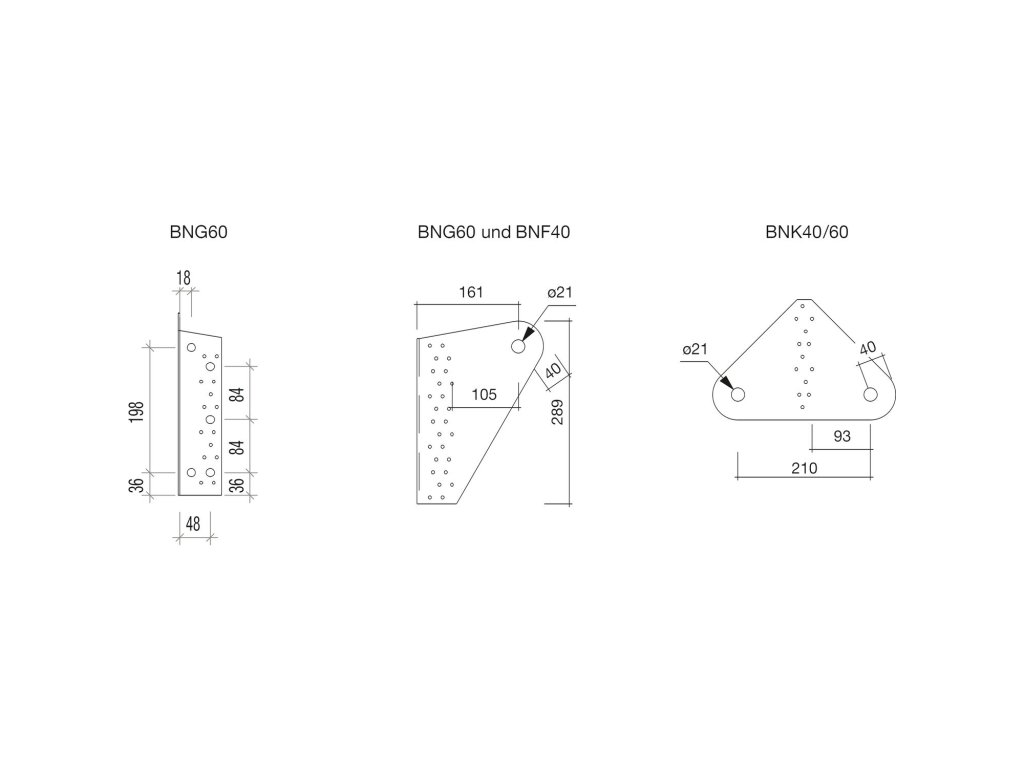 Jednostranné propojky pásky slouží jako koncové ukotvení zavětrovacích pásek na dřevěných konstrukcích. Jako spojovací prostředek mezi pásovým spojem a zavětrovacím páskem jsou určeny spojky BNKK a/nebo napínáky zavětrovacích pásek BNSP. Systém BNF se používá pro nízký rozsah zatížení.