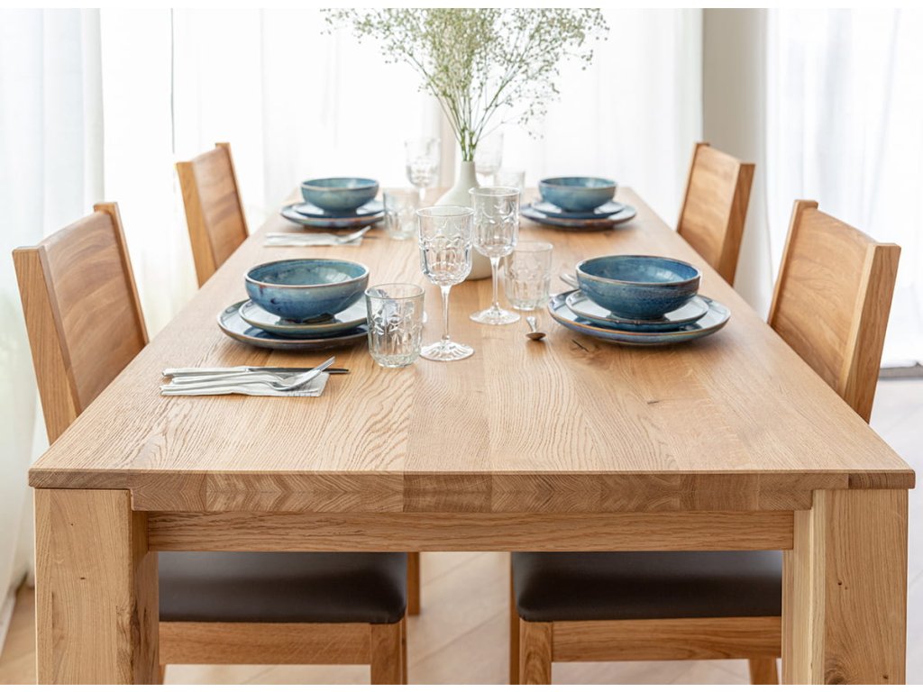 Dřevěný stůl vyzdvihuje všechny nejdůležitější přednosti dubu. Výrazná struktura dřeva, suky a kresba dodávají nábytku jeho charakter. Díky kouzelné kombinaci nadčasového stylu a jedinečné vůně se můžeme vrátit do bezstarostných časů a opět se cítit jako šťastné dítě, které spokojeně tráví čas pod obrovským stromem.