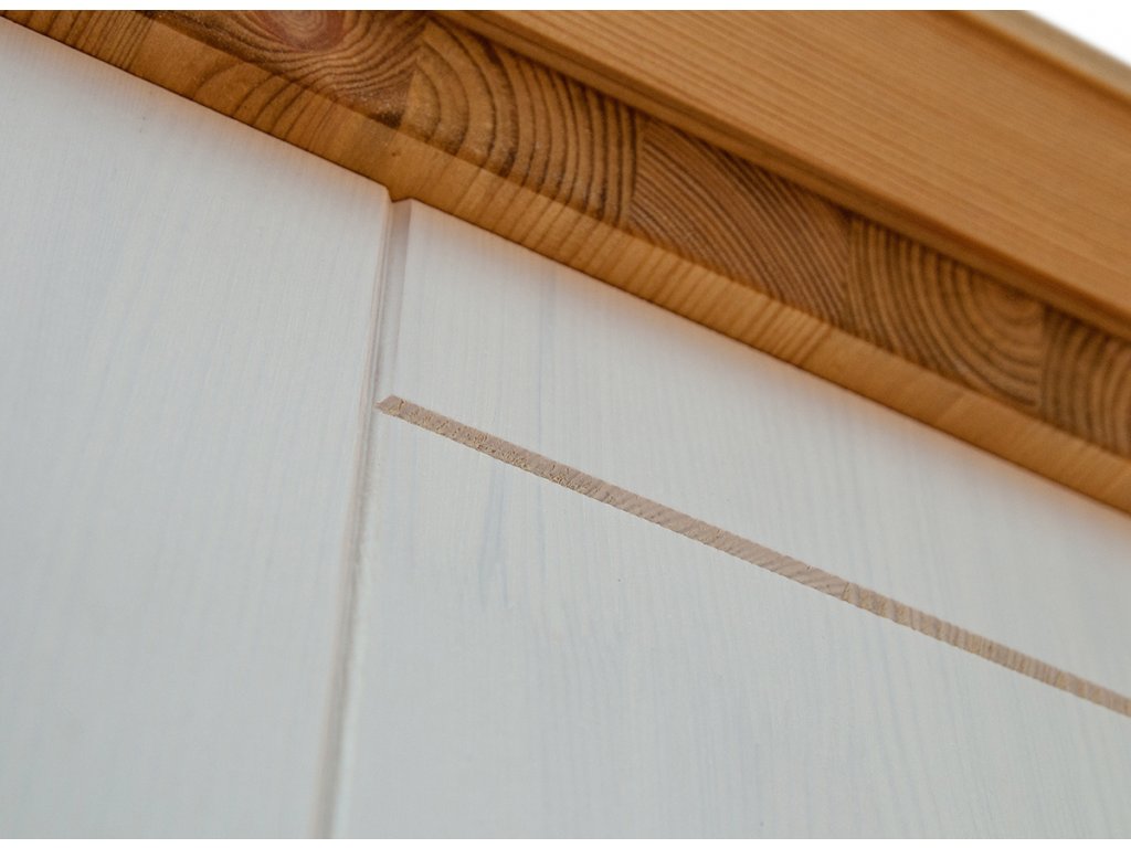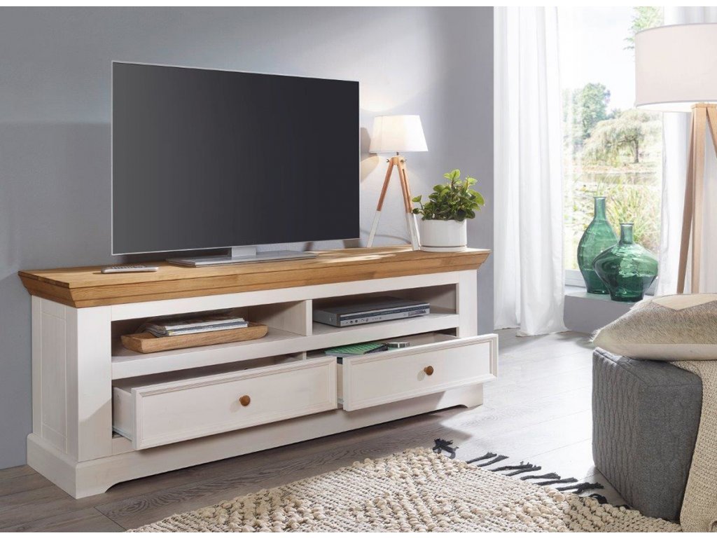Bílá komoda je potažena dřevěným voskem, který mu poskytuje další ochranu a umožňuje také vidět vzor zrna. Díky voskovému pokrytí přibližně 75% můžete jasně vidět krásně zdůrazněnou strukturu dřeva. Horní část komody, vyrobená ze dřeva, byla zesílena a pokryta mořidlovou skvrnou, která ze dřeva vyzařovala teplý odstín. Kombinace bílé a barvy přírodního dřeva osloví lidi, kteří milují originální řešení v klasickém stylu. Dřevěná TV komoda je vybavena dvěma hlubokými zásuvkami, které jsou ideálním místem pro ukládání hudebních nebo filmových CD. Další prostor nad zásuvkami poskytuje místo pro knihy, drobné předměty nebo domácí spotřebiče - například DVD přehrávač. Na horním stole je místo pro televizi a drobné příslušenství do obývacího pokoje. Doporučujeme také další nábytek Marone z naší kolekce.