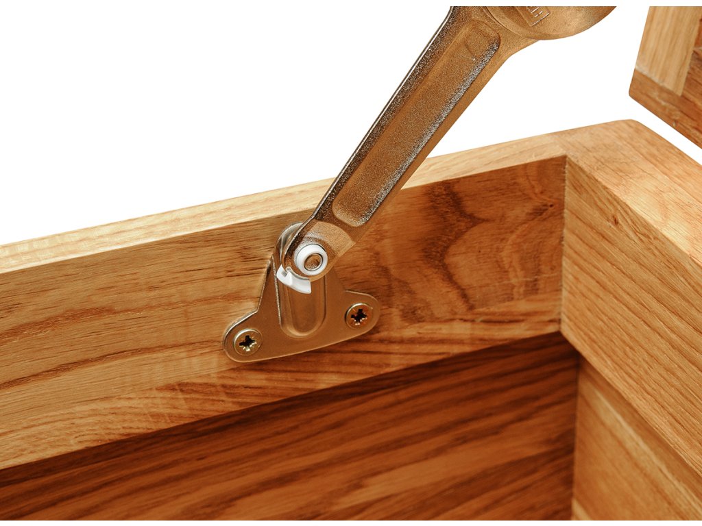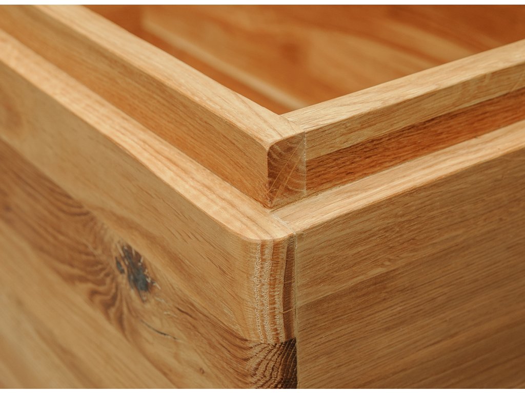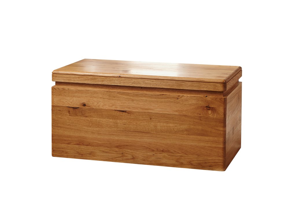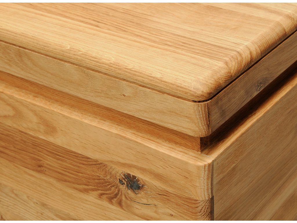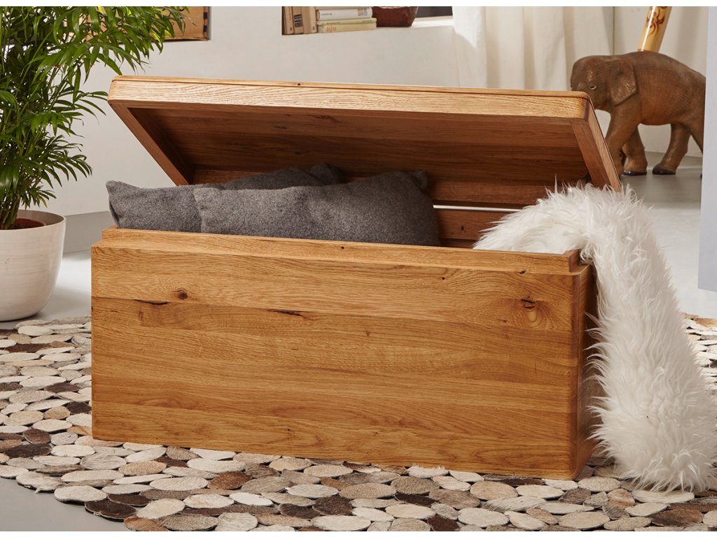 Dutina mezi deskou a korpusem se zaoblenými hranami podtrhuje jednoduchý design dřevěné bedny, zároveň ji díky ní snadno otevřete. V obývacím pokoji může truhla sloužit jako netradiční konferenční stolek, v chodbě zase jako lavice na přisednutí při obouvání. Stačí na ni při zavřeném víku umístit polštáře.
