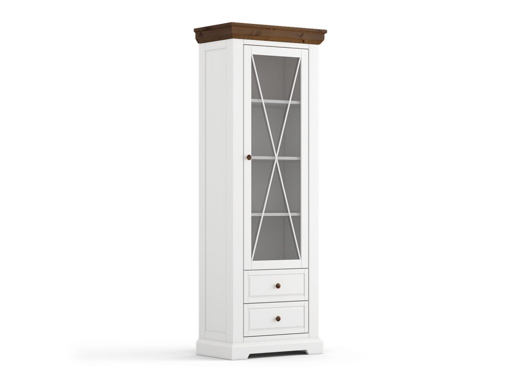 Úzká dřevěná vitrína je ideální volbou pro vystavení porcelánu nebo malých sbírek ve stísněných prostorách, jako je chodba nebo malý obývací pokoj. Její štíhlý design nezatěžuje interiér, a přesto poskytuje překvapivě mnoho výstavního prostoru. Dvě zásuvky ve spodní části pojmou nejrůznější doplňky, od příborů až po drobný textil, jako jsou ubrusy nebo ubrousky, a udrží je přehledné a snadno dostupné.