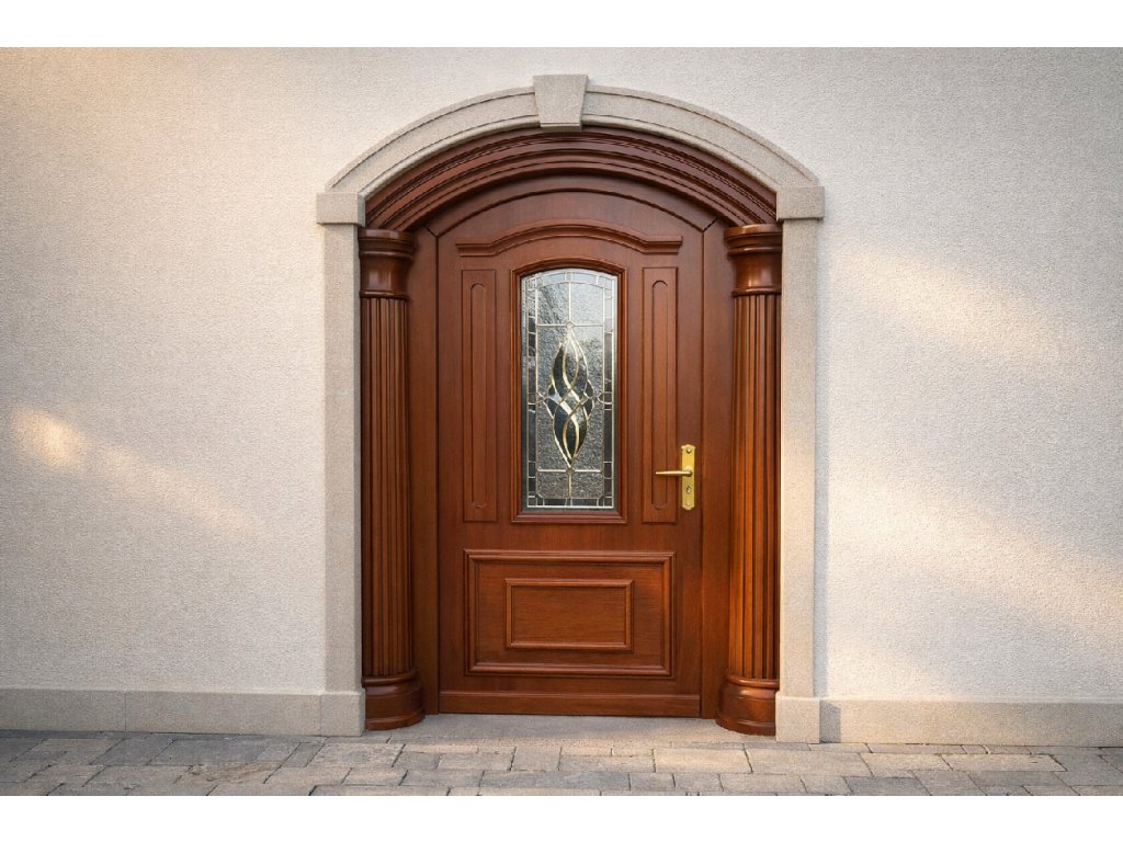 Elegance a bezpečí: Dubové dveře s uměleckou vitráží Model VD005 Tento model představuje harmonické spojení tradičního truhlářství a dekorativního umění. Dveře jsou navrženy tak, aby tvořily majestátní dominantu fasády.