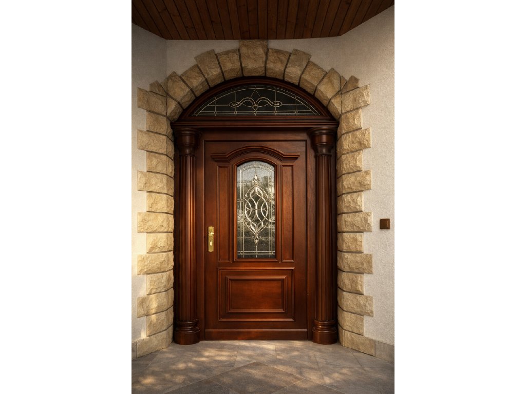 Bohaté prosklení: Dveřní křídlo i polokruhový nadsvětlík jsou osazeny dekorativní vitráží s klasickými motivy a fasetovanými prvky, které vytvářejí v interiéru nádhernou hru světla.