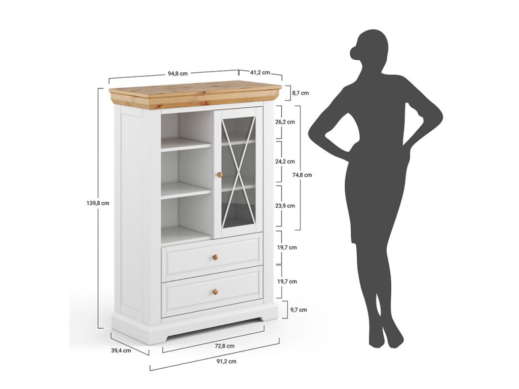 Tuto vitrínu můžete umístit do obývacího pokoje, jídelny nebo pracovny a výborně se hodí jako součást sbírky nábytku v provensálském stylu. Pro pečlivou údržbu nábytku použijte měkkou utěrku z mikrovlákna a jemné čisticí prostředky určené pro dřevěný nábytek nebo vodu. Vzhledem k citlivosti dřeva neumisťujte vitrínu v blízkosti zdrojů tepla nebo na přímé sluneční světlo.