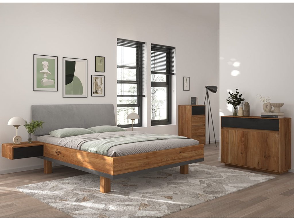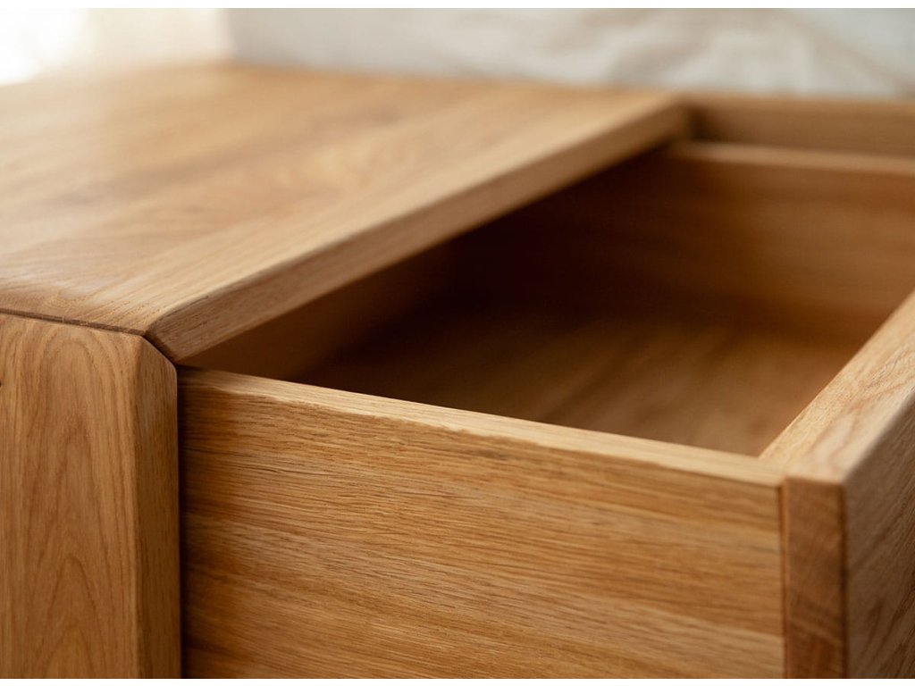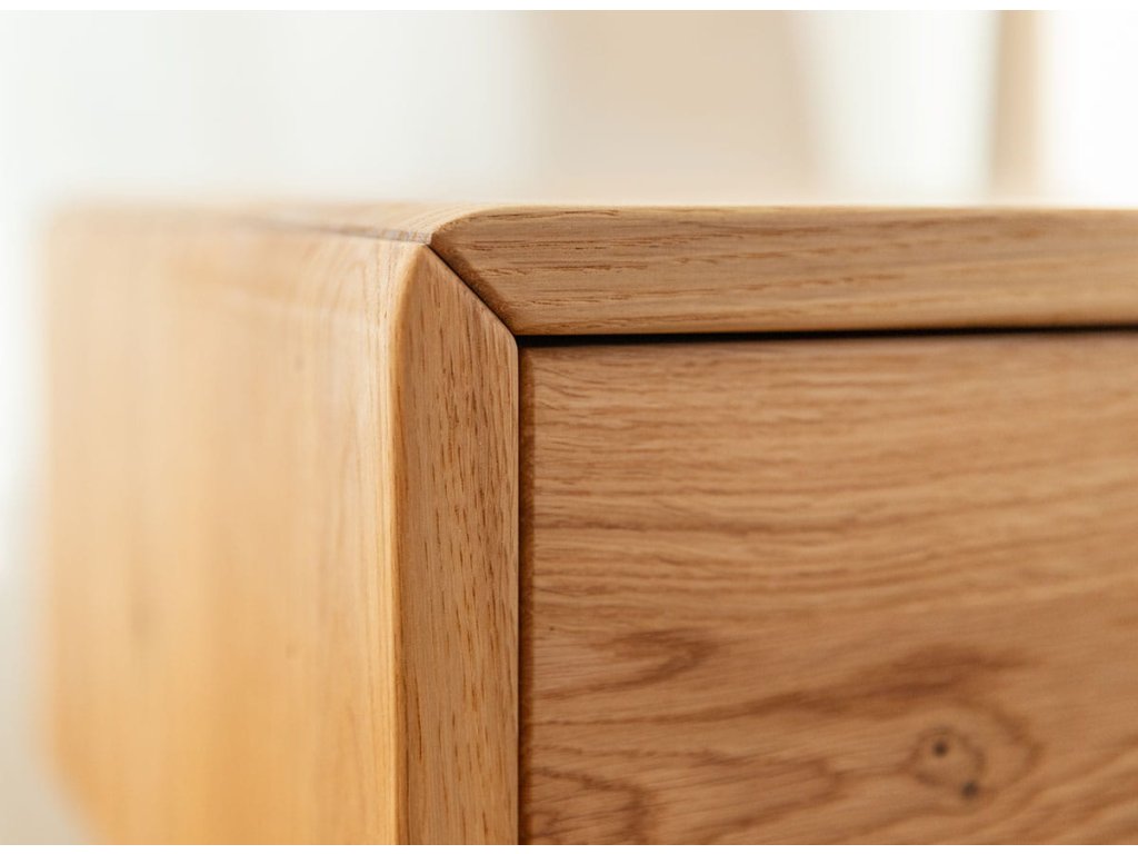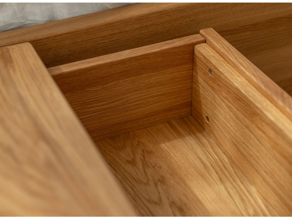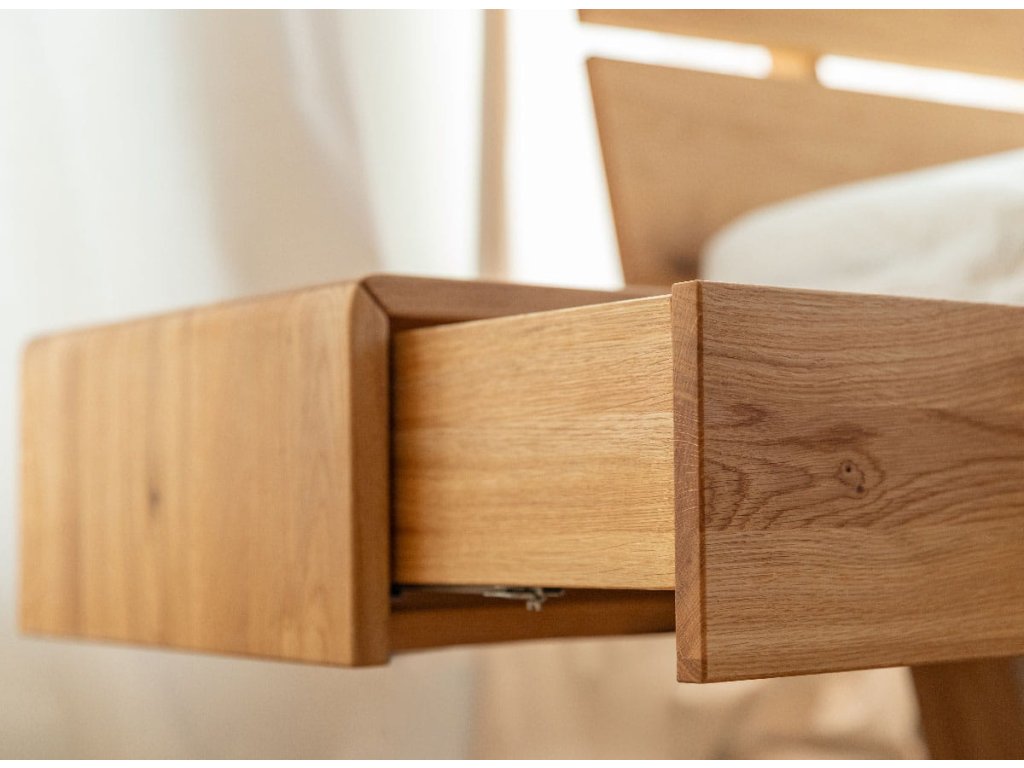 Celá skříň je vyrobena z masivního dubu – odolného, trvanlivého a rafinovaného materiálu. Dřevo je ošetřeno přírodním olejem Hesse, který zajišťuje zachování jeho vlastností a struktury. Tento nátěr také poskytuje vynikající ochranu proti vlhkosti a každodennímu opotřebení. Zásuvku lze vytáhnout bez tradičních úchytů – stačí ji uchopit za přední část. Toto řešení je praktické i esteticky příjemné. Skříňka je stabilní, pevně zabudovaná do rámu postele a navržena tak, aby vám dobře sloužila po mnoho let.